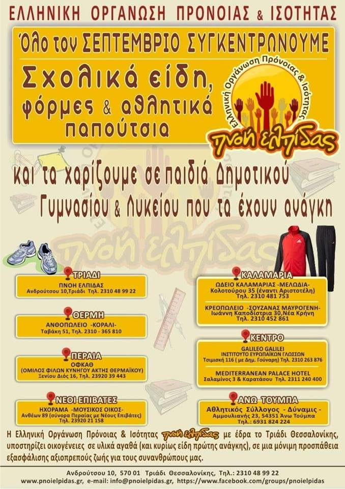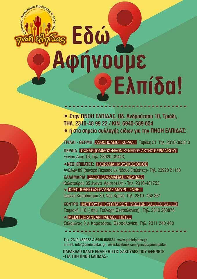 Στόχοι & Δράσεις : Οι σκοποί της Πνοή Ελπίδας είναι κοινωφελείς, φιλανθρωπικοί, ανθρωπιστικοί, οικολογικοί, πολιτιστικοί, μορφωτικοί, πολιτισμικοί. Ενδεικτικά περιλαμβάνουν την εθελοντική προσφορά βοήθειας, την κοινωνική προστασία και αλληλεγγύη, την απασχόληση, τη συνεργασία και κοινή δράση, όπου είναι δυνατόν, με οργανώσεις στο εσωτερικό και το εξωτερικό που έχουν παρόμοιους σκοπούς. Αφού ενημερωθούμε για τα περιστατικά και πάντοτε κατόπιν ενδελεχούς ελέγχου και προσεκτικής αξιολόγησης των αναγκών τους, ετοιμάζουμε και αποστέλλουμε δεκάδες δέματα με είδη πρώτης ανάγκης (ρουχισμό, τρόφιμα, σχολικά είδη, βρεφικά είδη, παιχνίδια, είδη οικιακού εξοπλισμού) σε όλη την Ελλάδα.
